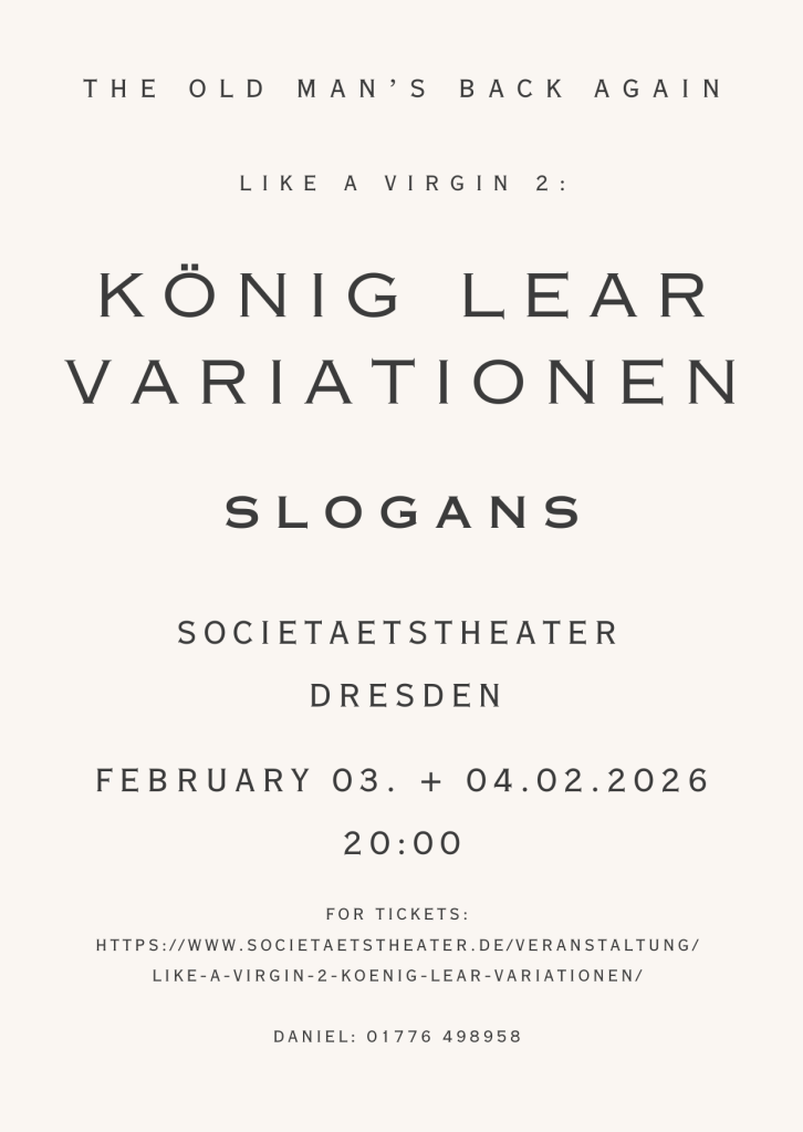 ‘In February 2025, I had the pleasure of seeing Daniel Williams’ recent work ‘König Lear Variationen’ at Societaetstheater, in Dresden. I found the work to be extremely exciting in a number of directions. First, the synthesis of theaterical ideas seemed to reflect not only Butoh, but also the abstract expressionism of the New York theater of the early 1990s, which I found very inspiring at the time. I was reminded in Daniel’s work of maverick directors such as Richard Foreman, although his piece was forging new directions. In that way, I felt the work broke away from the kind of stagnation in the literalism and overt messaging of much theater in the last decade. Instead Daniel’s work offers something which is abstract, and emotionally meaningful. In other words, it offers a language describing something beyond words, which I believe is one of the great purposes of theater.’